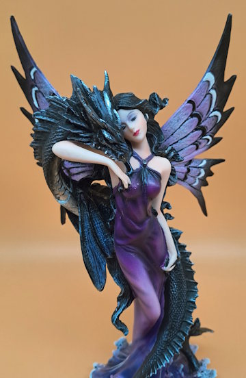 Diese exquisite Fantasy-Figur einer Elfe mit ihrem Wasserdrachen kombiniert Schönheit und Gefahr. Beide erheben sich aus rauhem Wasser, der Drache schlängelt sich an dem lila Kleid empor und legt seinen Schädel auf die Schulter der Elfe, die dann sanft ihr Gesicht an ihn schmiegt. Welch mystische Verbindung. Perfekt für jeden Liebhaber von Fantasy und Magie.